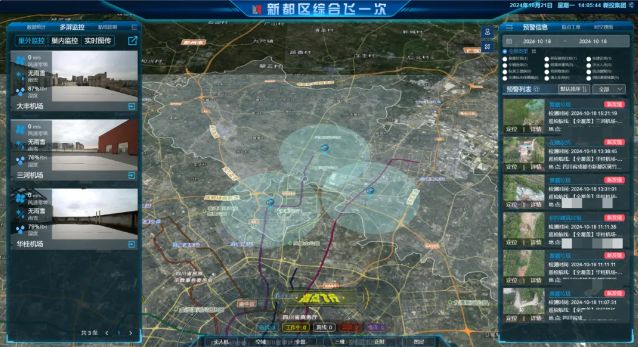 目前,香慧公司已在新都区大丰街道、三河街道、斑竹园街道辖区各部署一套无人机设备。无人机在接收到系统下发的飞行指令后迅速起飞,根据预先规划好的航线进行巡检,巡检完成后回传拍摄数据,后台分析事件并上报给相关单位研判处理。每台设备可覆盖半径4公里的范围,为新都区共计150平方公里的区域提供智慧巡检服务,打造出城市基层治理的“新都模式”。