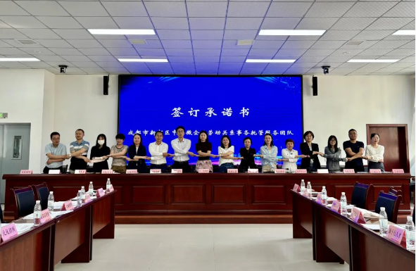推进会上,区人社局对团队组建和运营工作做出了安排和部署。随后,香城人资总经理刘青桦宣布“成都市新都区中小微企业劳动关系事务托管服务团队”正式成立。与会单位在现场就服务内容、各方责任及义务开展研讨,达成一致,签订了《遵守成都市新都区中小微企业劳动关系事务托管服务团队服务规则承诺书》。来自北京大成(成都)律师事务所的代表表示:“这项工作很有意义,不仅能切实解决劳动人事争议问题,降低维权成本,更是为区域和谐劳动关系创建,打造劳动争议多元化解新格局提供助力。”