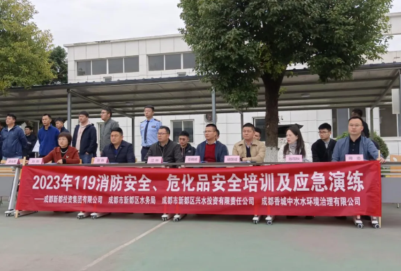 11月是全国消防宣传月,为深入学习贯彻习近平总书记关于安全生产和消防安全的重要指示精神,持续树牢安全红线意识,压紧压实安全生产责任,2023年11月16日,成都新都投资集团有限公司(以下简称“集团”)联合区水务局、香城中水公司在斑竹园净水厂组织开展2023年119消防安全、危化品安全培训及应急演练活动。区水务局、区应急局等相关领导现场观摩并指导。