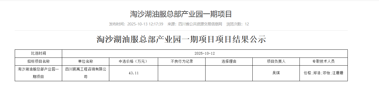 淘沙湖油服总部产业园一期项目招标代理机构比选结果公示